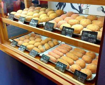 店内に入るとまず目につくのが10種類以上のオリジナル揚げパンが並んだ棚です。こちらの揚げパンはガラスケースの中に入っているので店員さんに注文して受け取るスタイルです。